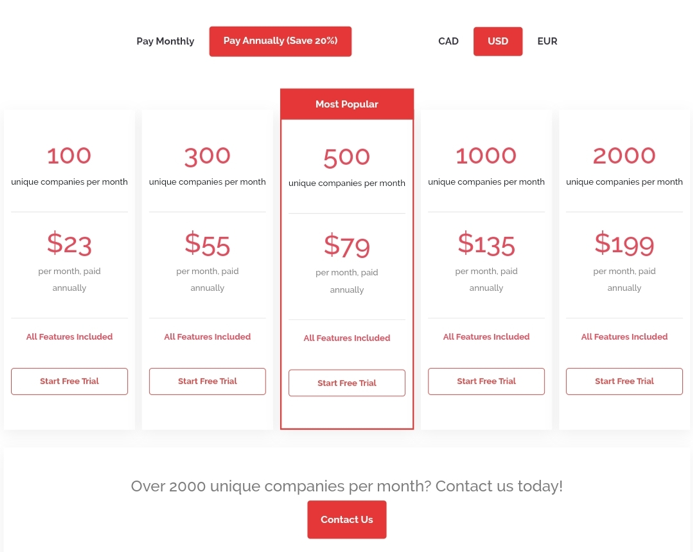 ビジターキューは、毎月見たいユニークな会社の数に基づいてプランを設定します。 これらのプランには次のものが含まれます(毎年支払われます)。