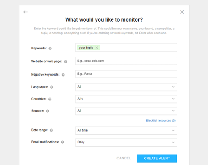 監視プロセスを簡単にするために、Awarioでは重要なキーワードのアラートを設定し、電子メールで通知を受け取ることができます。 アラートの頻度やその他のパラメータを設定できます。