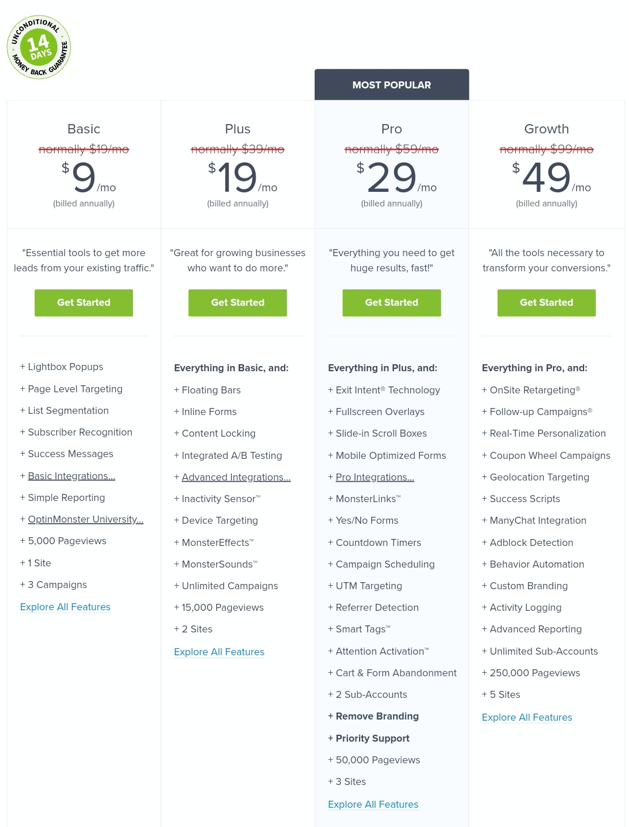 OptinMonsterは、年間サブスクリプション付きの4つのプランを提供しています。