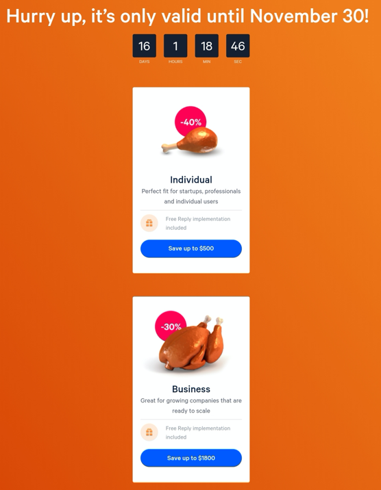ブラックフライデーの場合、Replyは個人プランで40%割引、ビジネスプランで30%割引を提供します。