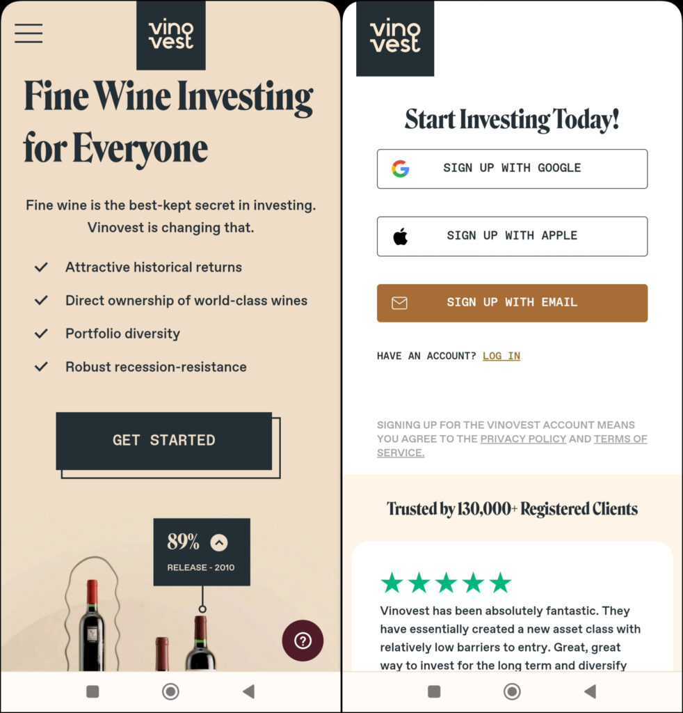 Vinovest は世界中の投資家にサービスを提供しており、サインアップするための唯一の要件は、居住国の法定飲酒年齢を超えていることです。 サインアッププロセスは非常に迅速で、ウェブサイトはユーザーフレンドリーです. サインアップする手順は次のとおりです。