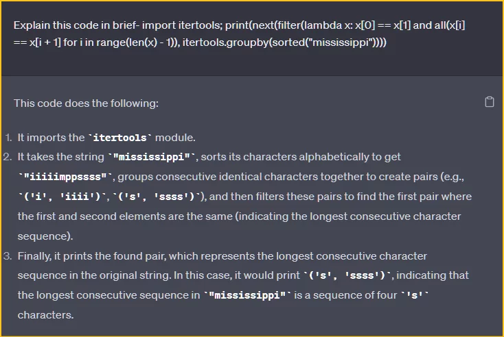 AI は平易な英語 (さらに言えば任意の言語) でコードを説明できます。 これは、新しい言語を学習している場合や、何をするのかわからないランダムなコード行に遭遇した場合に役立ちます。