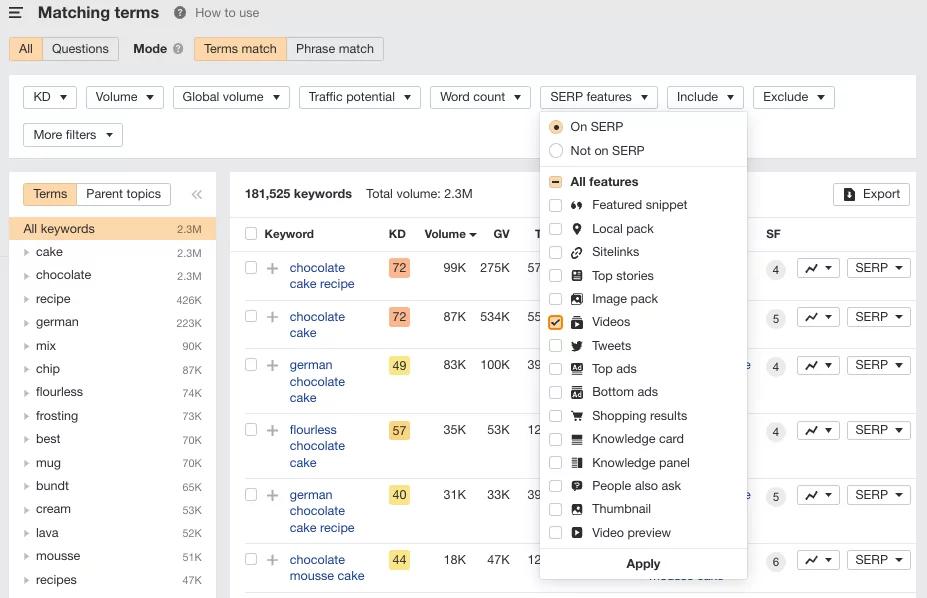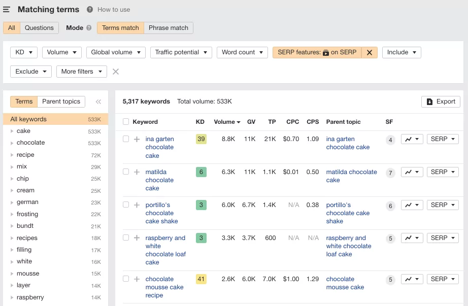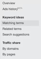 これは非常に一般的なクエリであるため、左側のメニューで [Matching terms] を選択します。