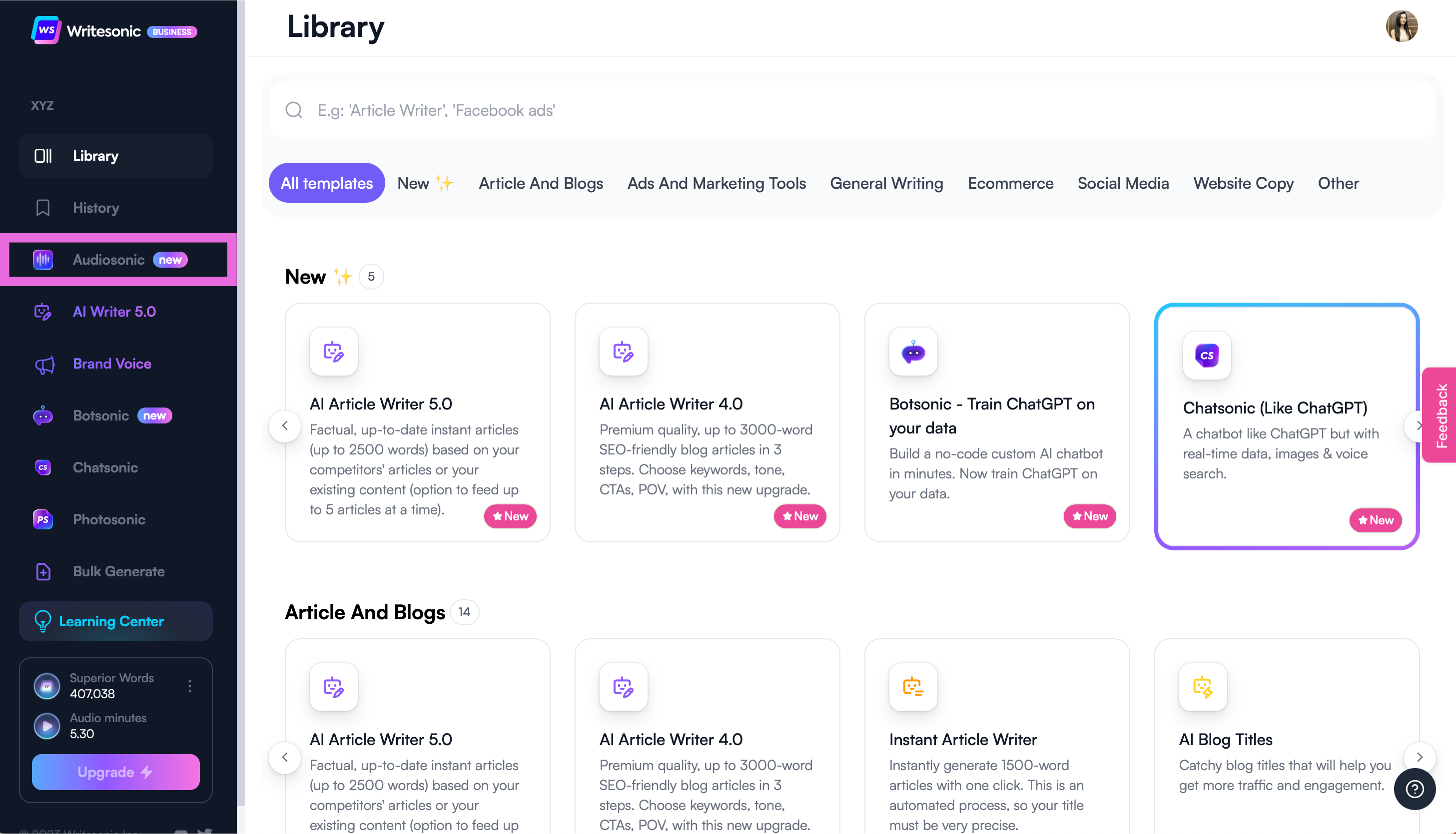 ステップ 1: Writesonic のダッシュボードで Audiosonic を見つける