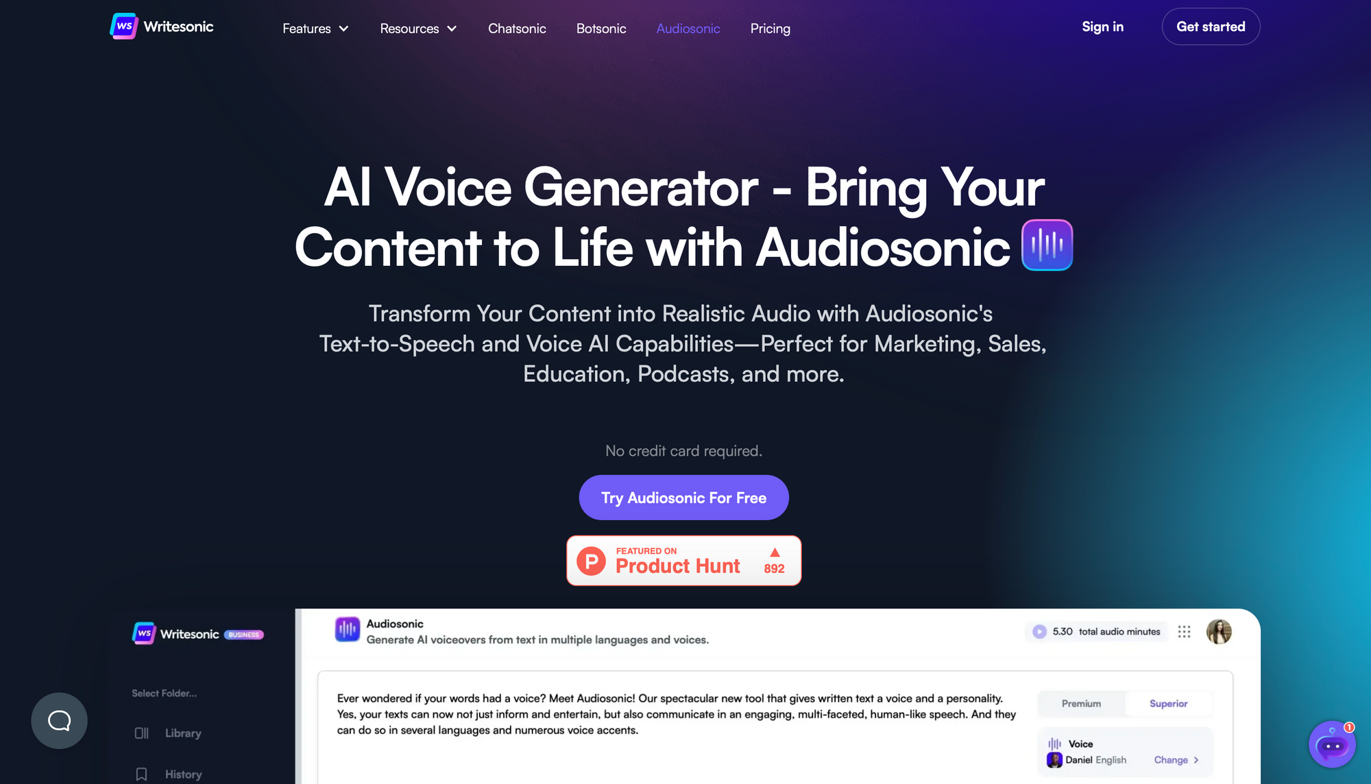 Audiosonic では、Writesonic にサインアップすると、人間のようなオーディオを 10 分間無料で生成できます。