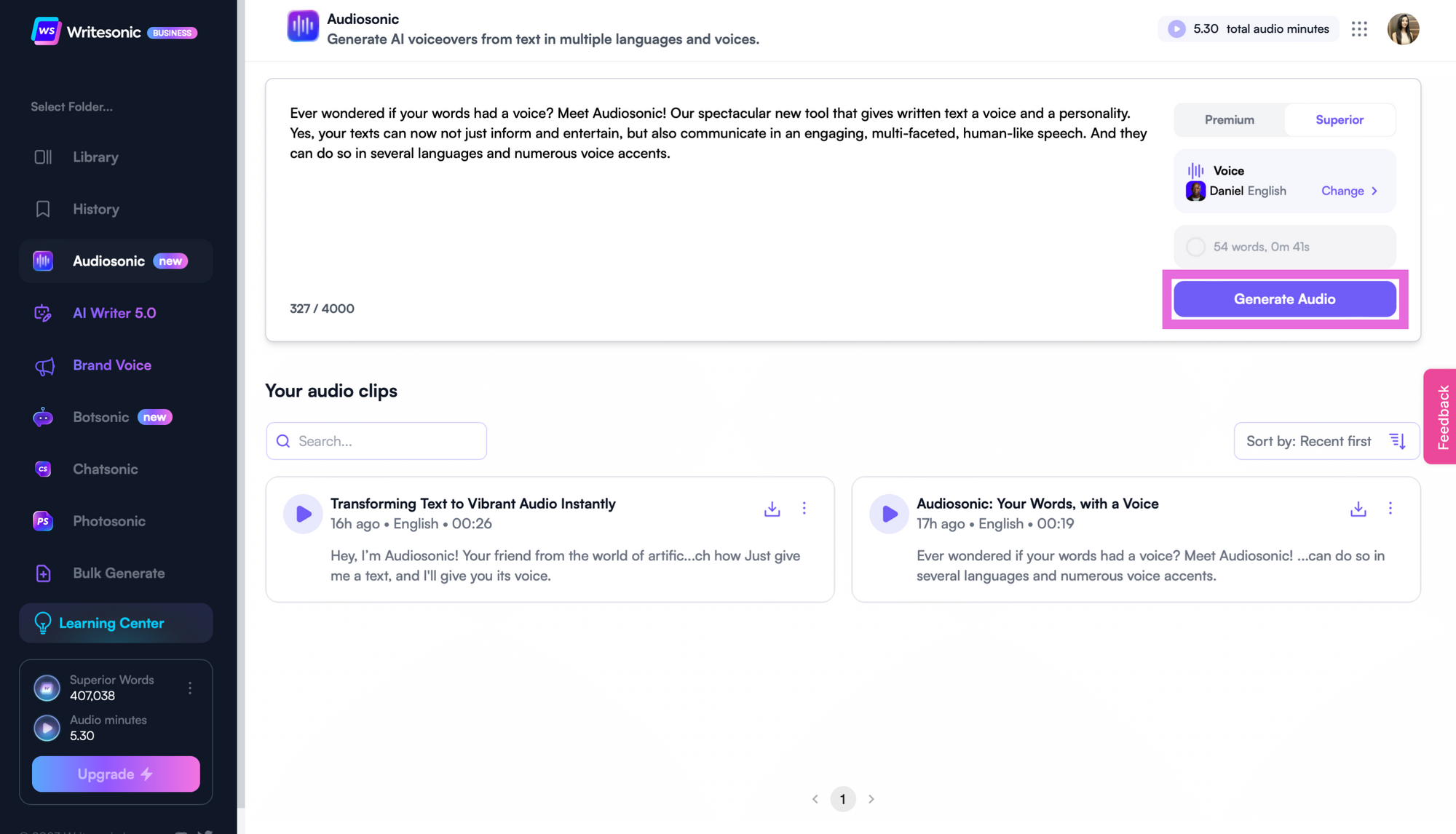 詳細に満足したら、「オーディオを生成」ボタンをクリックします。 そしてタダ! さあ、Audiosonic はあなたの好みに応じて、テキストを人間のような魅力的な音声に瞬時に変換します。