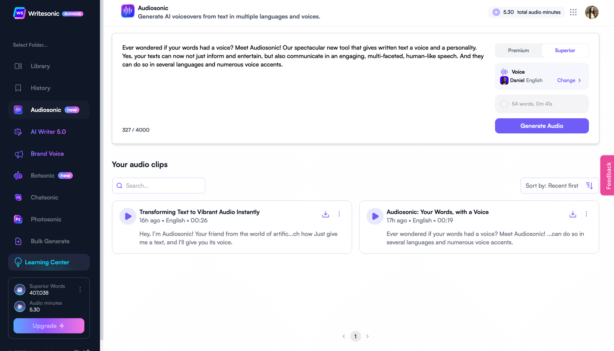 Writesonic の Audiosonic は単なる音声ジェネレーターではありません。 それはオーディオ体験の世界における真の変革です。 高度なテキスト読み上げジェネレーターは、書かれたテキストを自然で感情豊かな人間のような音声にシームレスに変換できます。