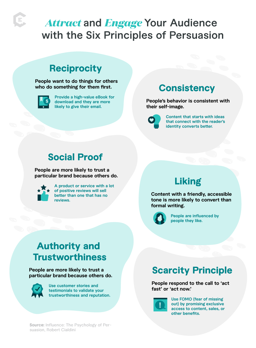 相互主義の規範は、#contentで価値のあるものを提供した後、読者に何かをするように説得するのがより簡単になることを意味します。 クリックしてツイート彼の本の中で、チャルディーニは影響力の6つの原則を紹介しました:相互主義、一貫性、社会的証明、好み、権威、そして希少性。 これらの各原則を詳しく見ていきましょう。
