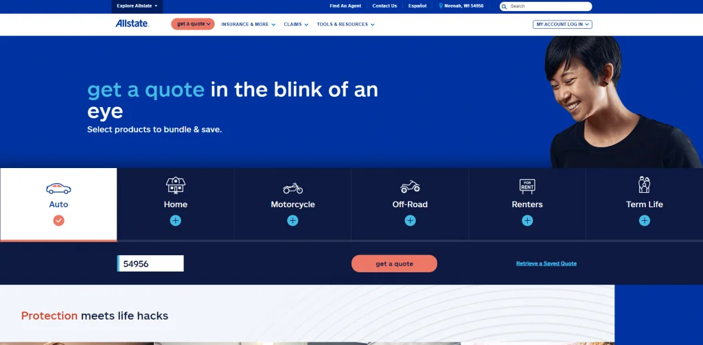 Liberty Mutual의 웹사이트는 밝은 노란색 인트로 헤더로 시선을 사로잡습니다. 바로 보험 견적을 받기 위해 작성해야 하는 양식이 있습니다. 홈페이지에서 볼 수 있는 다른 유용한 리소스도 있습니다. 보험 웹사이트는 세 가지 범주로 구분되어 잠재 고객이 개인, 비즈니스 보험 및 비즈니스에 대한 정보를 정확하게 볼 수 있도록 매우 유용합니다. 각 범주에는 정보 및 유용한 리소스가 포함된 더 많은 링크가 있습니다.