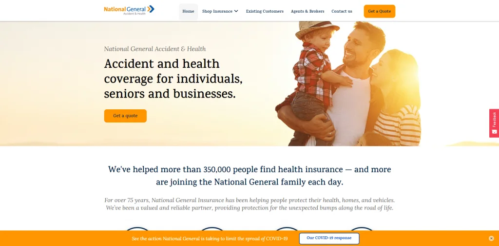 이 웹사이트는 매우 깨끗하고 매력적입니다. 쓰여진 내용과 함께 할 많은 시각 자료가 있습니다. 이 사이트의 첫 번째 기능은 방문자가 다른 사람들의 경험을 읽고 이 보험 회사가 신뢰하고 싶은지 확인할 수 있도록 하는 고객 평가입니다. 고정 헤더가 있는 정보를 탐색하는 것은 매우 쉽습니다. 또한 모든 링크가 소셜 미디어 링크와 함께 페이지 하단에 표시됩니다.