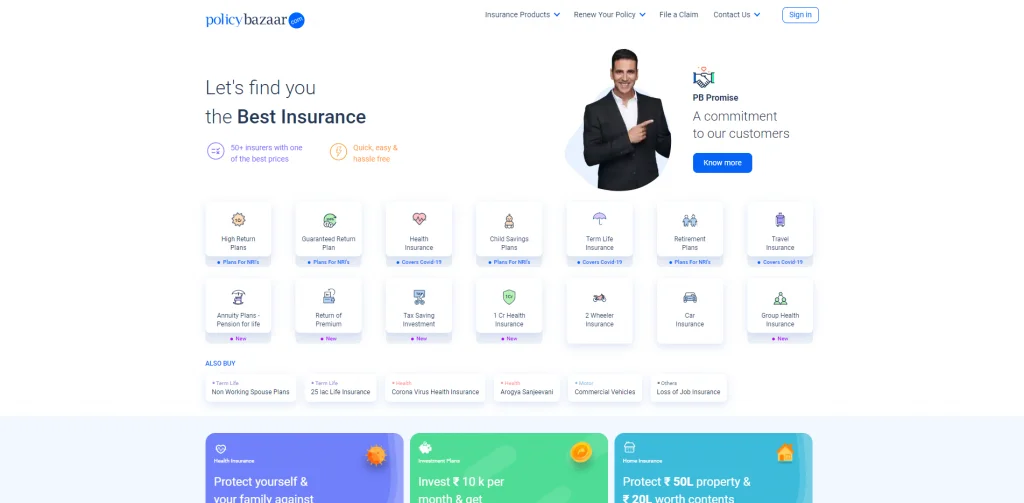 Coverfox는 잠재 고객이 찾고 있는 보험을 찾는 데 도움이 되는 양식을 제공합니다. 또한, 그 옆에 페이스북과 구글 리뷰를 볼 수 있습니다. 이 웹 사이트의 홈페이지에 있는 또 다른 내용은 방문자가 왜 이 회사를 보험으로 선택해야 하는지에 대한 정보이며 그렇게 함으로써 신뢰를 구축해야 합니다. 온라인으로 보험에 가입할 수 있는 옵션이 있으며, 보험 가입 방법을 정확하게 보여주는 영상을 보여주어 혼란이 없습니다. 홈페이지 하단에는 행복한 고객 후기가 페이지를 스크롤합니다.