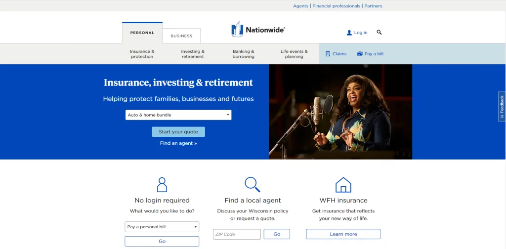Nationwide는 개인 및 비즈니스 서비스를 제공하므로 페이지 상단에서 분리하여 홈페이지에 적은 정보를 제공합니다. 이 회사는 잠재 고객을 위해 가능한 한 쉽게 만드는 데 중점을 둡니다. 로그인, 지역 에이전트를 찾고 그들이 제공하는 보험에 대해 자세히 알아보기 위한 검색창이 있습니다. 고객은 로그인을 통해 클레임을 제기하고 청구서를 지불하는 등의 작업을 수행할 수 있습니다. 해당 링크는 페이지 상단과 하단 모두에서 볼 수 있고 잘 정리되어 있습니다.