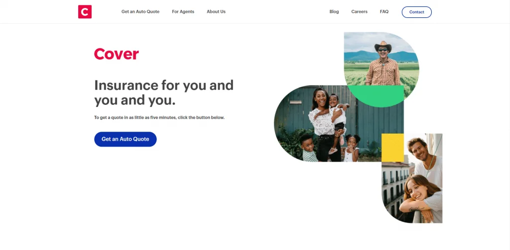 Cover의 웹사이트는 심플한 디자인이 매력적입니다. 주제 사이에 충분한 공간이 있는 단순한 흰색 배경이 있습니다. 정보를 구분하는 데 도움이 되는 크고 대담한 헤드라인. 또한 청중을 참여시키기 위해 몇 가지 질문이 있습니다. 홈페이지에서 눈에 띄는 몇 가지 기능은 고객 평가와 소셜 미디어 링크입니다. 이 페이지에서 눈에 띄는 것은 블로그, FAQ 및 페이지 상단에 보이는 연락처 버튼입니다.