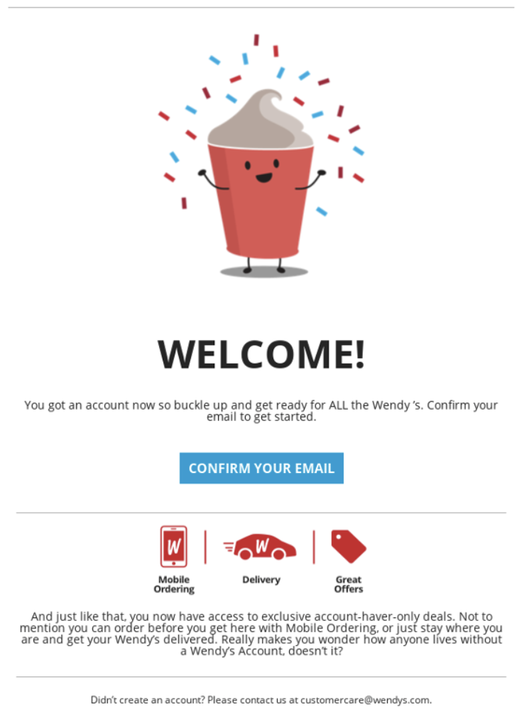 Wendy's의 마케팅 팀은 옵트인 프로세스를 훌륭하고 쉽게 유지하여 구독자가 프로세스를 조기에 포기하지 않도록 했습니다. 또한 신규 구독자에게 확인을 요청하는 것은 데이터를 깨끗하게 유지하면서 클릭을 생성할 수 있는 확실한 방법입니다. 봇은 허용되지 않습니다!.