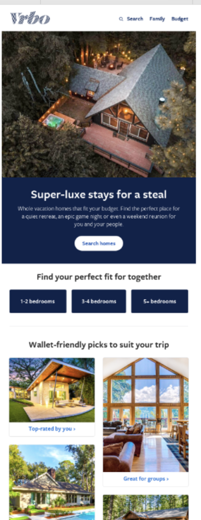 저렴한 가격에 럭셔리한 숙박을 심플하게 병치해 가입자의 관심을 끌도록 설계됐다. 거기에서 VRBO는 짧지만 유용한 CTA 버튼 목록과 제한적이지만 아름다운 선별 그룹 팔레트를 통해 캠페인을 통해 독자를 끌어들입니다.