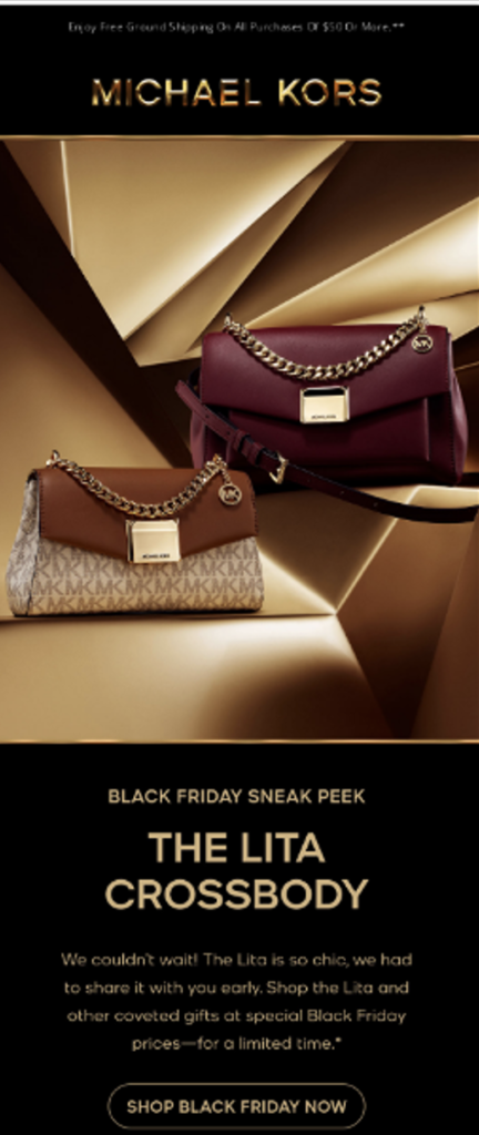 구독자는 이 아이템이 자신의 스타일리시한 룩을 어떻게 보완할지 상상하게 합니다. 카피와 CTA는 함께 작동하여 블랙 프라이데이 할인을 강조하고 시간에 민감한 거래의 매력도 발휘합니다.