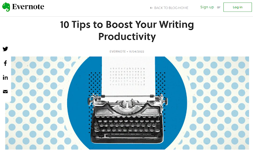 한 가지 예는 "작문 생산성을 높이는 10가지 팁"이라는 게시물입니다. Evernote는 이 기사에서 도구를 미묘하게 통합하지만 주요 목표는 분명합니다. 작성자가 작업을 간소화하도록 진정으로 돕는 것입니다.