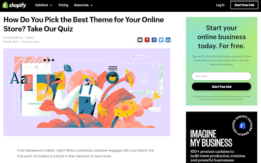 그들의 "온라인 상점에 가장 적합한 테마를 어떻게 선택합니까?" 퀴즈는 사용자 경험에 대한 그들의 약속에 대한 증거입니다. 잠재적인 사용자에게 선택권을 제공하는 대신 "가입"을 클릭하기도 전에 개인화된 답변으로 안내하고 있습니다.