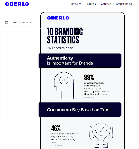 그런 다음 Shopify용 직송 앱인 Oberlo가 있습니다. "당신이 알아야 할 10가지 브랜딩 통계"를 한 눈에 보면 아름답게 만들어진 인포그래픽을 만나게 됩니다. 그리고 그들은 단지 예쁜 비주얼이 아닙니다. 그들은 이해를 향상시키고, 통계를 돋보이게 만들고, 단락을 헤매지 않고도 독자들에게 정보의 빠른 스냅샷을 제공합니다.