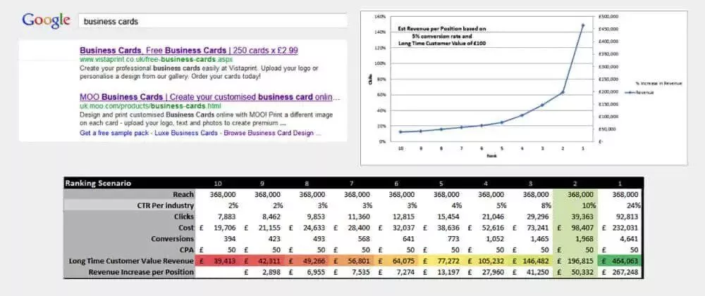 개선된 유기적 트래픽에 대한 위의 추정이 실제 수익에 미치는 영향도 상당히 쉽게 추정할 수 있습니다. 회사에 대한 간단한 웹 전환 및 판매 수치만 있으면 됩니다.