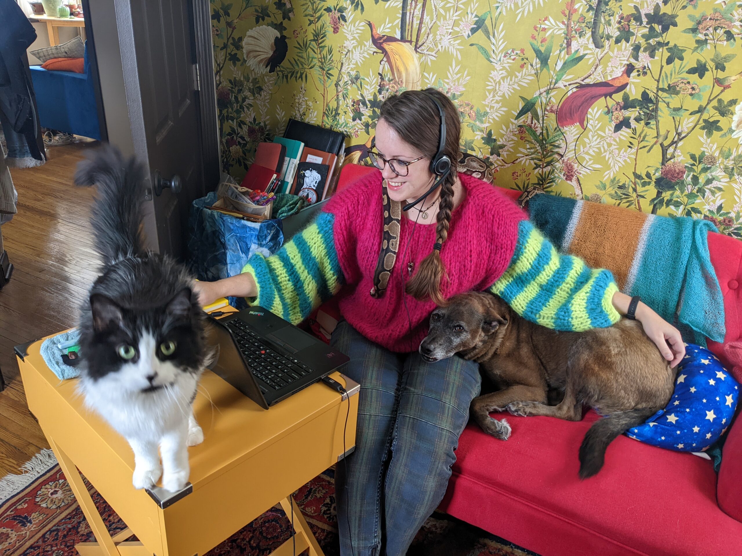 Laura Holt는 몇 마리의 애완동물을 키우고 있으며, 이들 모두가 하루 종일 그녀와 함께 있습니다. "특히 애완동물은 하루 중 저에게 많은 기쁨을 주고, 내 볼파이썬을 화면에 표시하는 것은 회의에 활기를 불어넣는 확실한 방법입니다!"