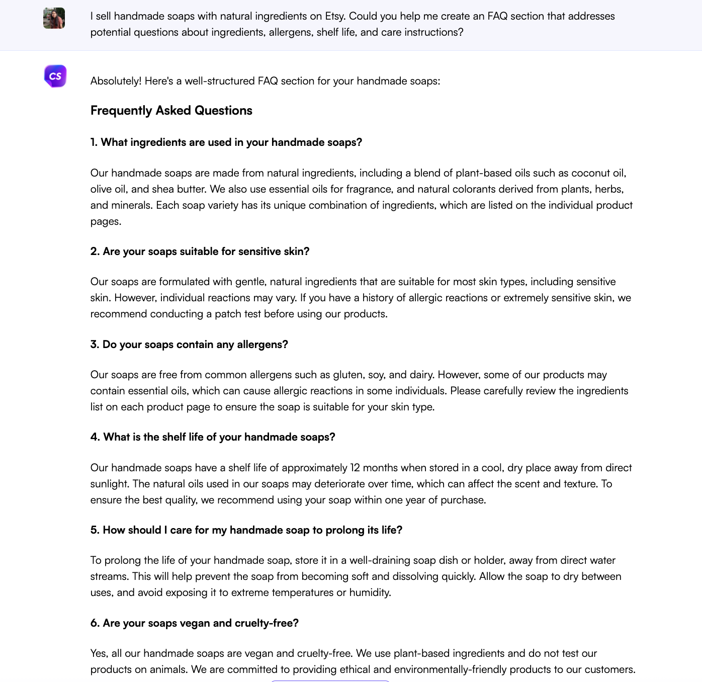 또한 ChatGPT의 텍스트 생성 기능이 엄청나게 향상되었습니다. 이제 일관성을 유지하면서 더 길고 자세한 콘텐츠를 생성할 수 있습니다. 따라서 제품 사용에 대한 자세한 '사용 방법' 가이드를 만들거나 블로그에서 공유할 흥미로운 이야기를 만들 때 ChatGPT가 Etsy 쇼핑 도우미가 될 수 있습니다.