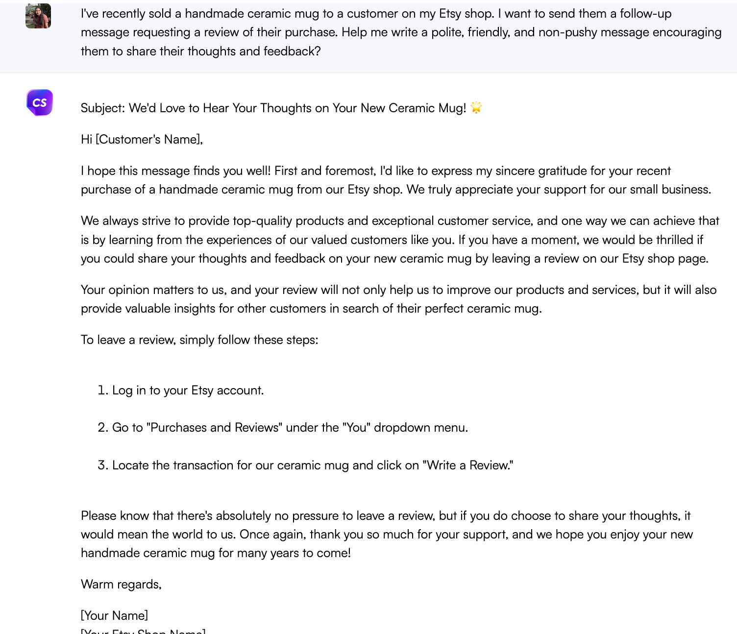 최근 Etsy 매장에서 고객에게 수제 세라믹 머그를 판매했습니다. 구매 검토를 요청하는 후속 메시지를 보내고 싶습니다. 그들이 자신의 생각과 피드백을 공유하도록 격려하는 정중하고 친근하며 강압적이지 않은 메시지를 작성하도록 도와주시겠습니까?