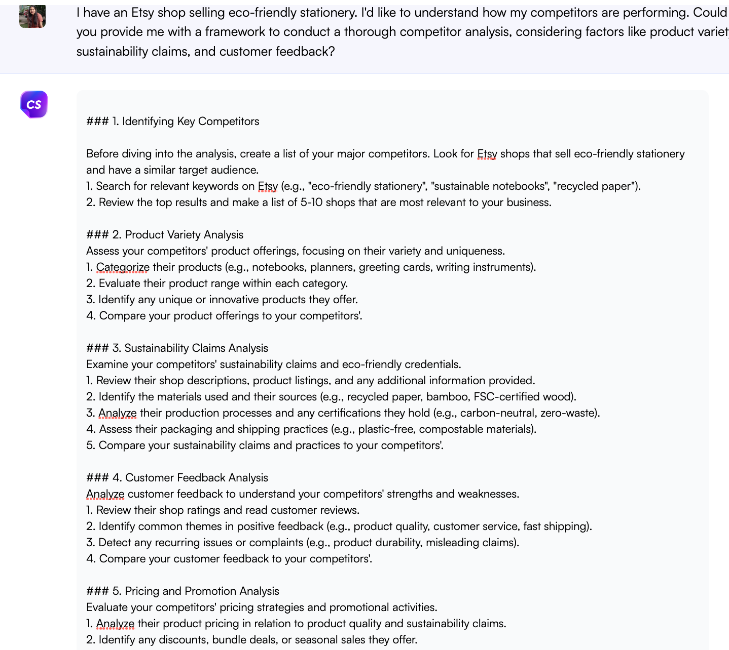 친환경 문구류를 판매하는 Etsy 매장이 있습니다. 경쟁업체의 실적을 알고 싶습니다. 제품 다양성, 지속 가능성 주장, 고객 피드백과 같은 요소를 고려하여 철저한 경쟁사 분석을 수행할 수 있는 프레임워크를 제공해 주시겠습니까?