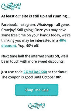 Facebook 플랫폼이 중단된 후 1시간 이내에 첫 번째 이메일이 받은 편지함에 들어오기 시작했습니다. 이 이메일에는 "Instagram/Facebook이 다운된 동안 주의가 산만합니다..."(Mott & Bow) 및 "Instagram(Got U) Down?"과 같은 제목이 포함되어 있습니다. (룰루의).