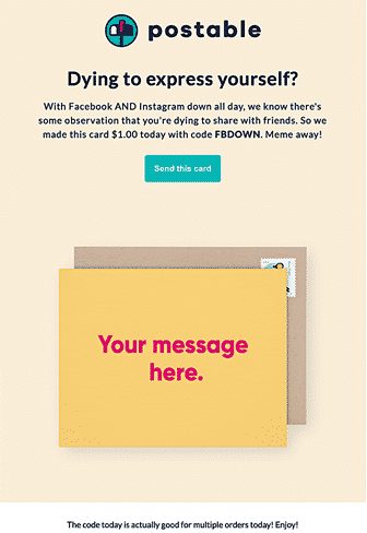 Postable과 같은 다른 브랜드는 단 몇 시간 만에 사용자 정의 쿠폰 코드를 포함한 전체 캠페인을 만들었습니다.
