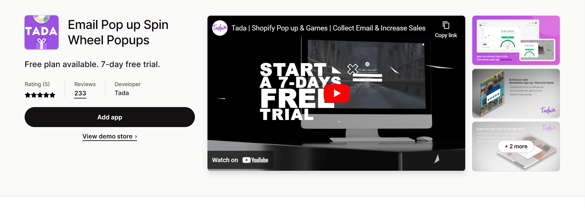 또 다른 Shopify 게임화 앱인 Tada를 사용하면 사용자가 팝업을 클릭하여 휠을 돌리거나 특수 상자를 선택할 때 계속하기 전에 이메일 주소를 묻습니다. 따라서 메일링 리스트를 늘리는 좋은 방법입니다.