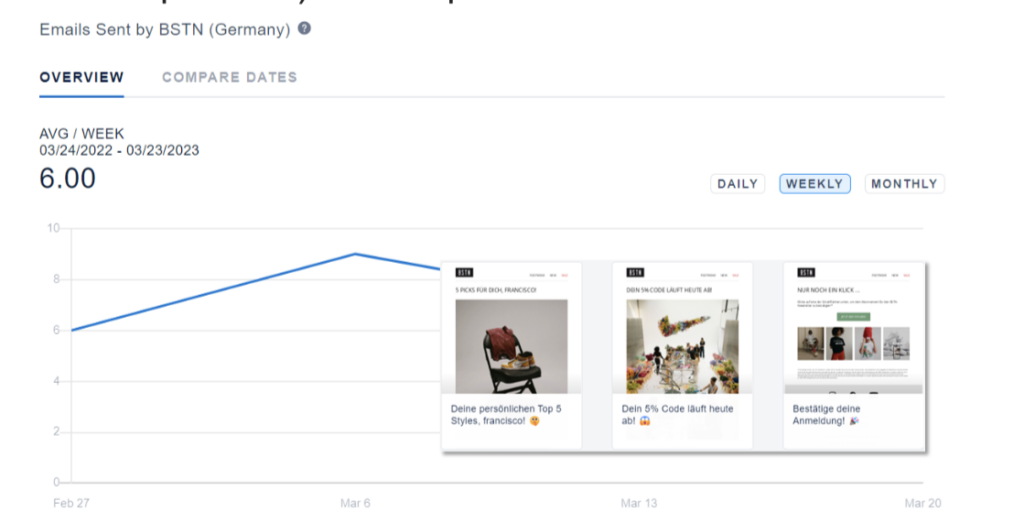 Validity MailCharts는 독일 이메일 프로그램의 전송 프로필을 분석했습니다. 일반적인 가입자는 일주일에 ±3개의 이메일을 받습니다.스포츠웨어 소매업체 BSTN( 주당 평균6개의 이메일 전송) 과 같은 발신자는 규칙의 예외입니다.
