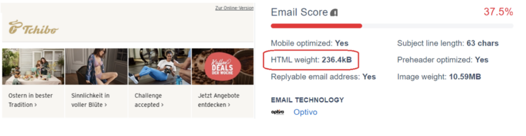 이 MailCharts 이메일 점수는 Tchibo와 같은 발신자가 이 권장 지침의 두 배 이상 이메일을 정기적으로 배포한다는 것을 보여줍니다. 잘림은 옵트아웃 링크 및 "Impressum"과 같은 중요한 요소가 표시되지 않음을 의미하므로 보낸 사람이 법적 의무를 이행하지 않은 것입니다.