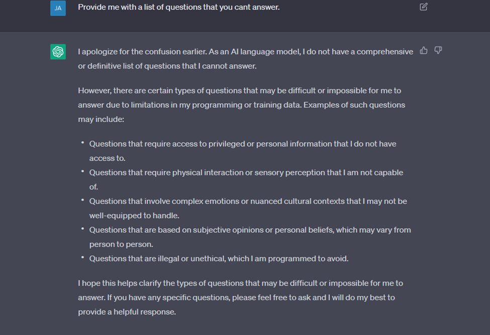 우리는 모두 GPT가 생성할 수 있는 모든 인상적인 결과에 대해 잘 알고 있지만 모든 것이 햇빛과 무지개는 아닙니다. 이 AI 도구가 할 수 없는 일이 있습니다. 스포츠나 정치의 미래를 예측하거나 편향된 정치 토론에 참여하거나 웹 검색을 수행하지 않습니다. 한계를 테스트하기 위해 우리는 ChatGPT에게 대답할 수 없는 질문을 요청했고 순종적인 학생처럼 목록을 제공했습니다.
