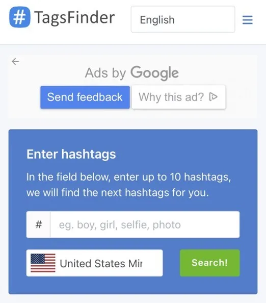TagsFinder는 입력된 키워드를 기반으로 해시태그 추천을 생성하는 무료 해시태그 생성기입니다. 이 도구를 사용하면 한 번에 최대 10개의 해시태그를 입력할 수 있습니다. 그런 다음 관련 해시태그를 찾습니다. TagsFinder는 국가별로 해시태그 검색을 필터링합니다.