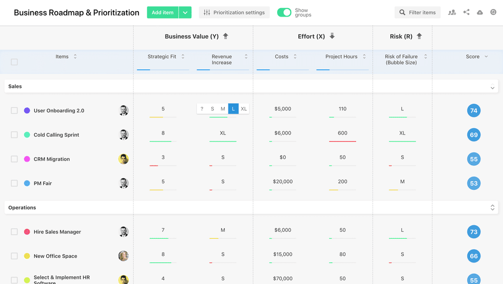 Roadmunk는 또한 Value vs Effort 및 RICE와 같은 프레임워크를 기반으로 하는 우선 순위 지정 도구를 제공합니다. 전반적으로 매우 좋은 도구이지만 철학과 기능 세트는 다소 기업적이고 약간 복잡하게 느껴집니다.