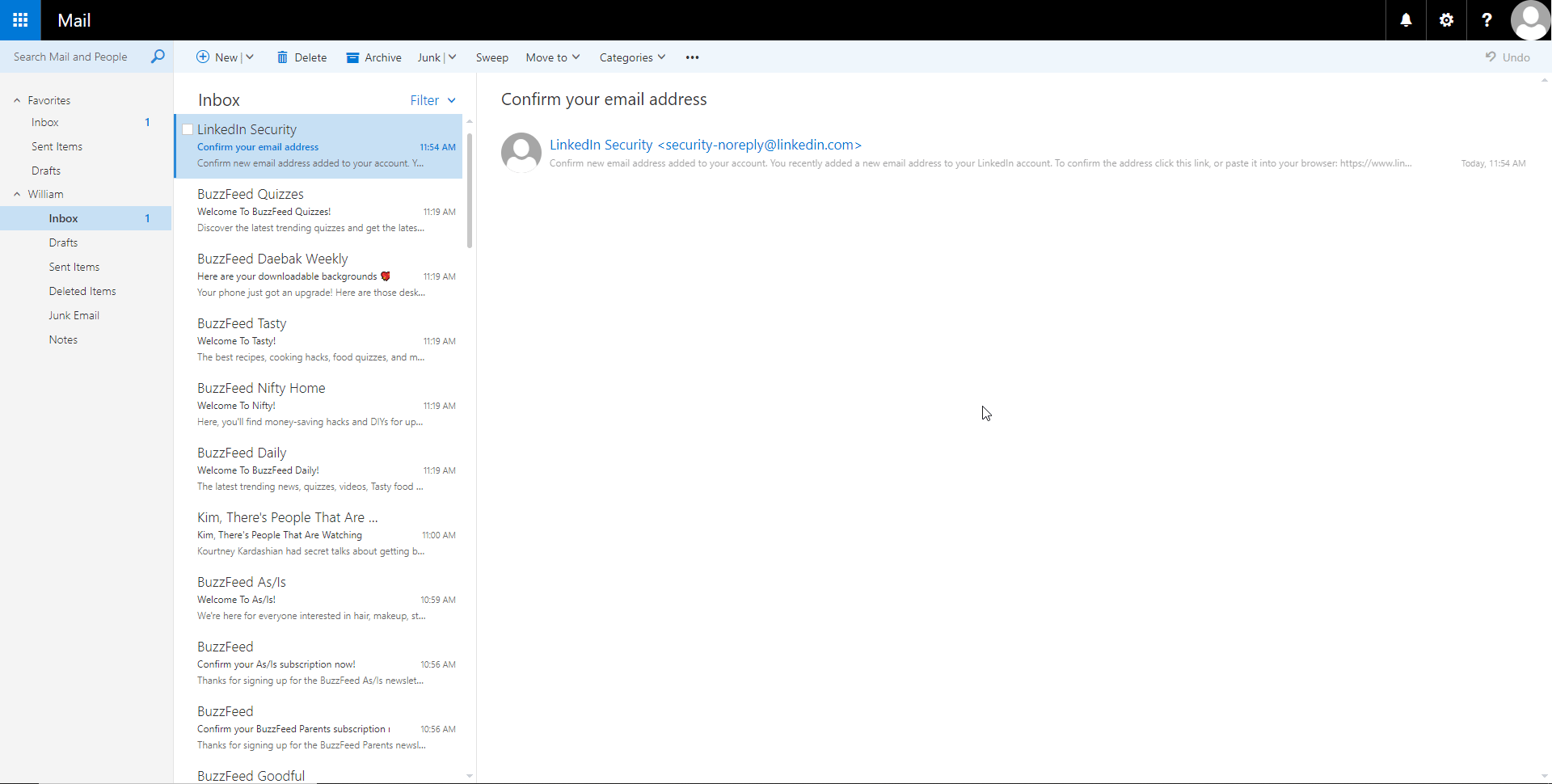 뉴스레터당 Buzzfeed에서 하나의 이메일, 즉 46개를 받게 됩니다. 각 뉴스레터에 대해 버튼을 클릭하여 이메일 주소를 확인해야 합니다. 모든 확인 이메일을 받으면(물론 전문 이메일 주소에 연결해야 함) 받은 편지함 하단으로 스크롤하여 모든 Buzzfeed 이메일을 로드한 다음 콘솔에 다음 코드를 추가할 수 있습니다.