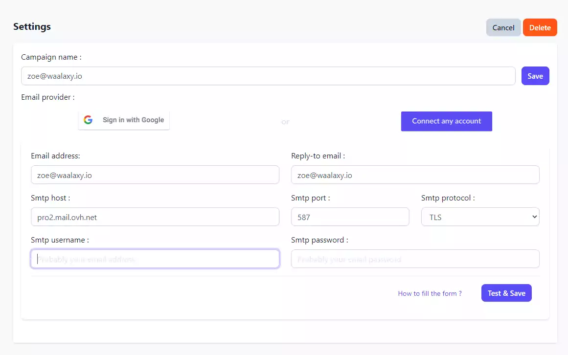 그런 다음 SMTP 매개변수 를 입력해야 합니다(Mailwarm이 사서함에 액세스하고 이메일을 관리할 수 있음). 우리의 경우 OVH 매개변수입니다. 다른 메일 공급자를 사용하는 경우 Google에서 "provider_name SMTP 설정"을 검색하십시오.