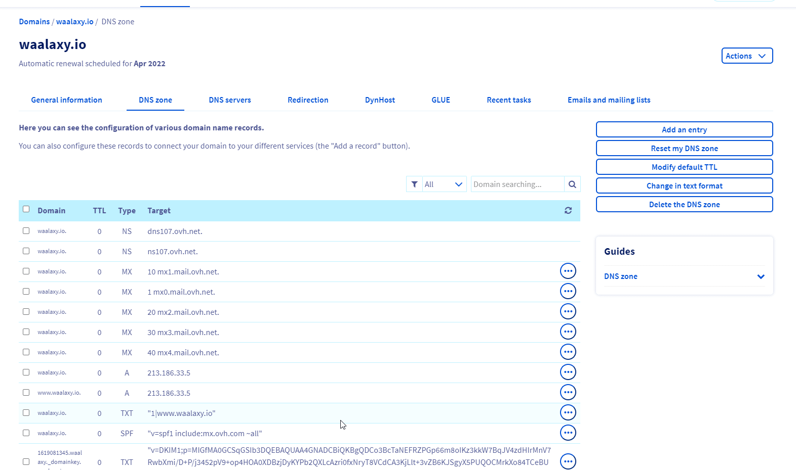 SPF를 구성 하려면 OVH 이메일 측면에서 기본 서비스를 사용하는 경우 매우 간단합니다. OVH의 관리자 패널로 돌아가서 도메인 이름을 선택 하고 DNS 영역 으로 이동해야 합니다. 그런 다음 OVH의 기본 구성으로 이 작은 자습서를 따르십시오.