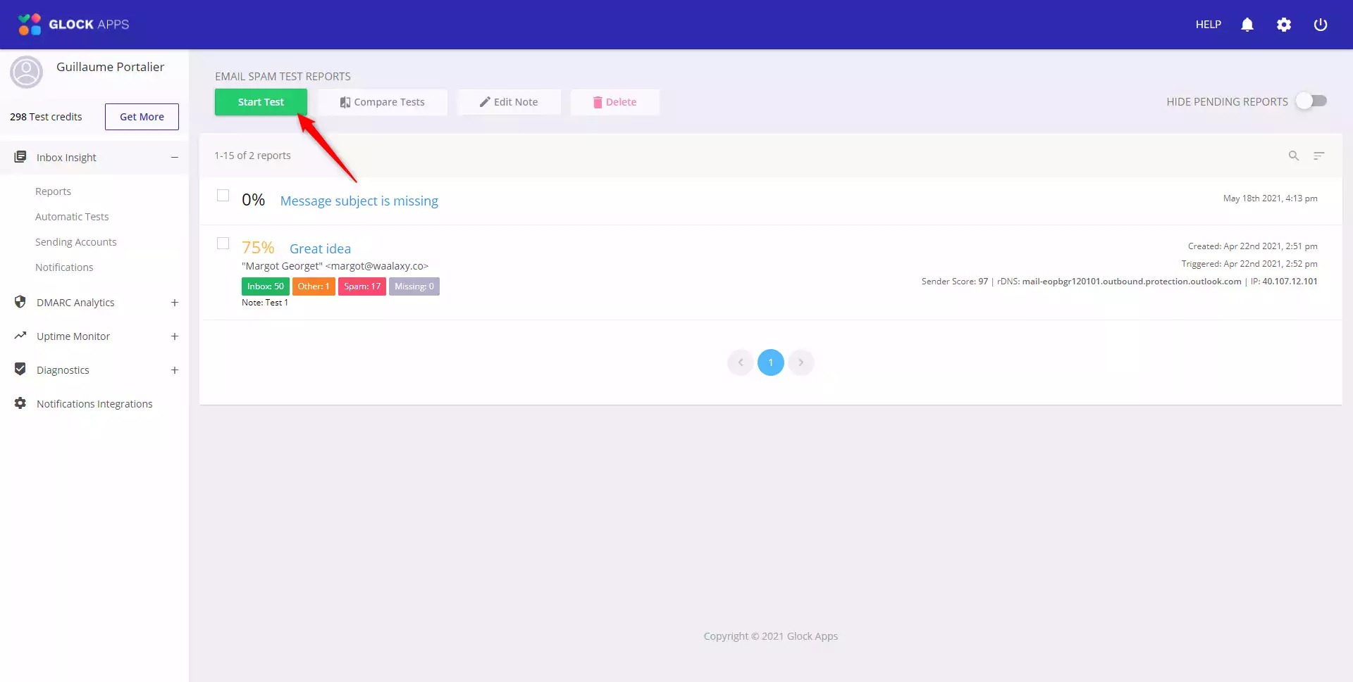 이제 도메인 이름을 분석하고 최신 광고에 대한 권장 사항을 제공하는 도구인 Glockapps를 사용하여 전달 가능성을 테스트할 시간입니다. Glockapps에서는 3회의 감사에 대한 평가판을 받게 되며 그 후에는 비용을 지불해야 합니다. 테스트를 수행하려면 홈 페이지에서 "테스트 시작"을 클릭해야 합니다.