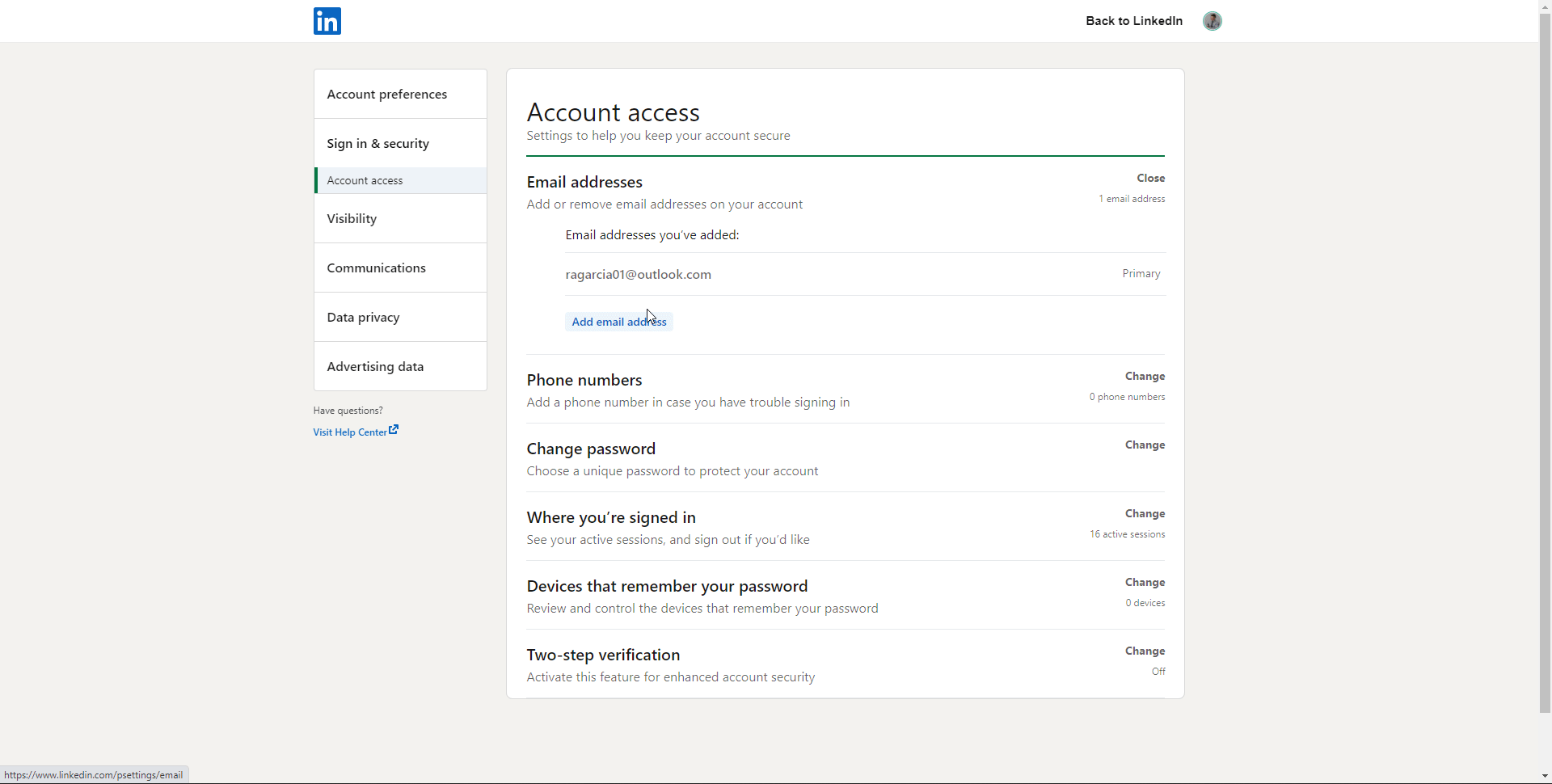 모든 LinkedIn 이메일 알림이 활성화되고 계정으로 잠재 고객을 찾고 있을 때 하루에 최소 10개의 이메일이 전송됩니다. 따라서 이 새 메일로 사용 중인 LinkedIn 계정 을 업데이트하고 모든 알림을 활성화할 것입니다. LinkedIn 설정 페이지의 "식별 및 보안" 섹션으로 이동하여 새 이메일을 입력하세요.