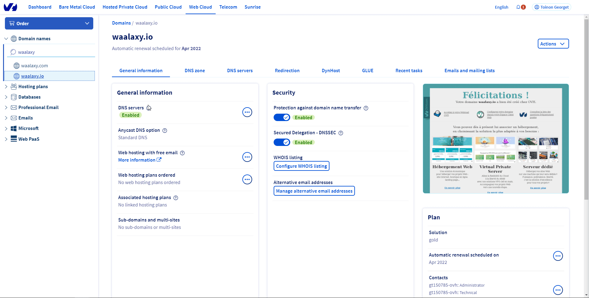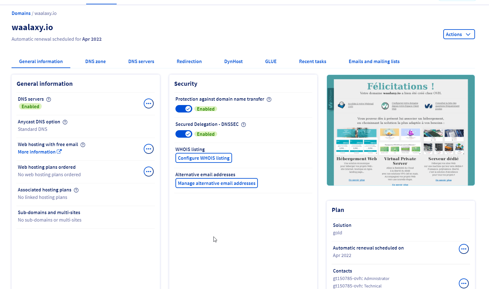 개인적으로 호스팅 및 도메인 이름 서비스 가 중앙 집중화되어 있기 때문에 OVH 사이트를 사용합니다. 다른 제공업체에서 구입할 수도 있습니다(예: Google Domain, 이 경우 이 서비스를 구성하는 사례 연구 참조).