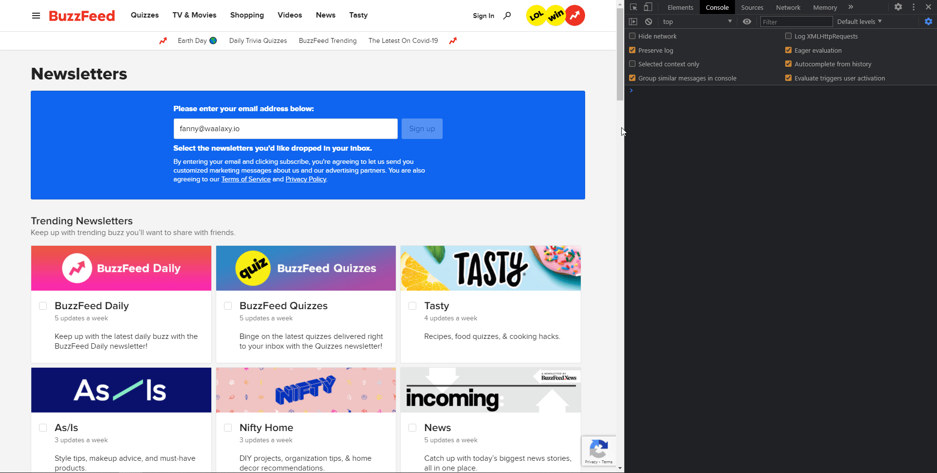 하기 쉽습니다. Buzzfeed로 이동하여 이메일 주소를 입력하고 모든 뉴스레터를 구독하십시오. 저는 게으름뱅이이기 때문에 약간의 개발자 배경 지식이 있고 최소 5개의 계정을 구성해야 합니다. 다음은 한 번에 모든 뉴스레터를 선택하는 코드입니다.