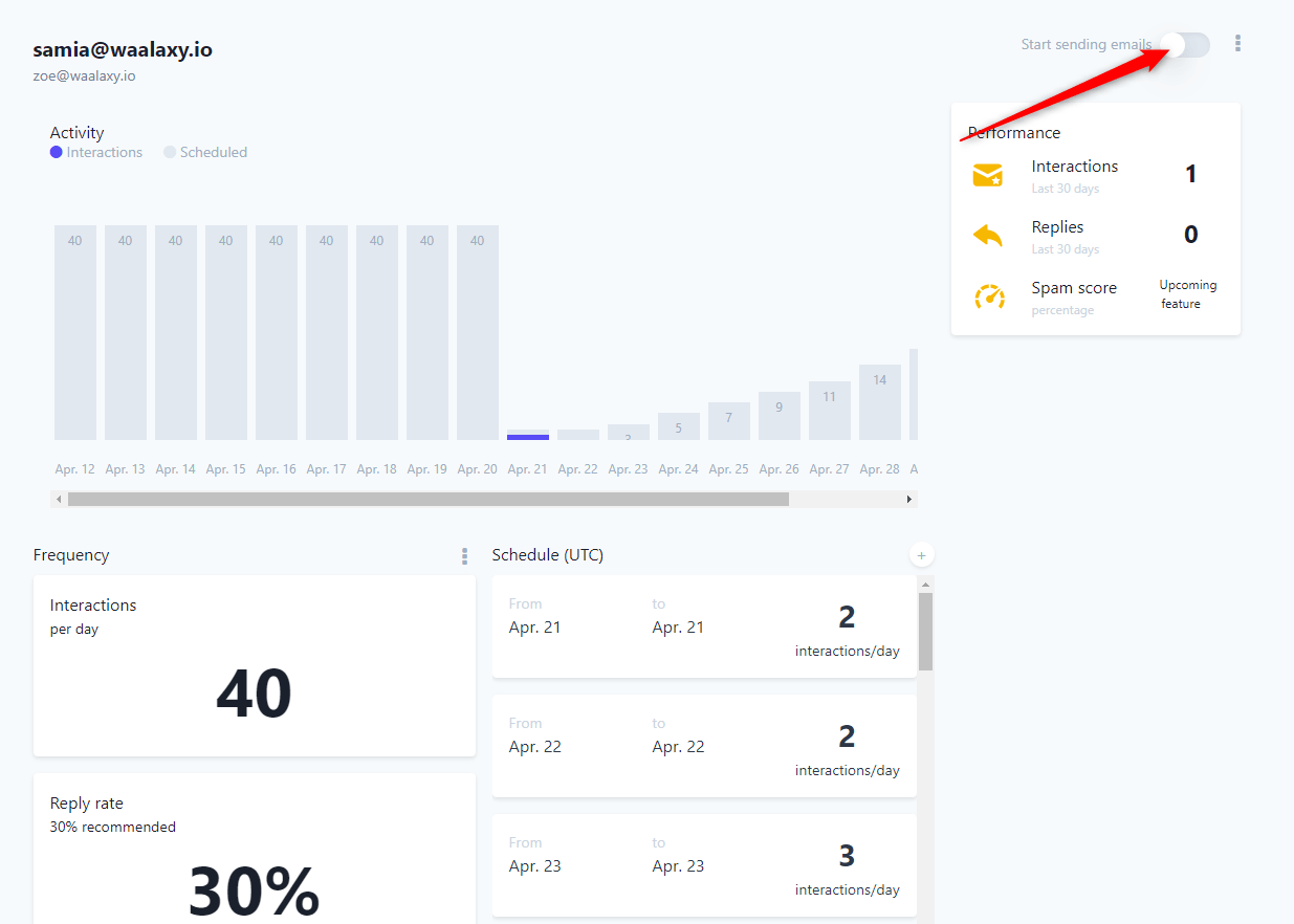 개인적으로 모든 매개변수를 기본값으로 두고 시스템을 활성화했습니다. 우리는 하루에 2개의 메일로 천천히 시작하여 약 2주 후에 40개에 도달하기로 결정했습니다. 예, 첫 번째 실제 콜드 메일 캠페인 을 시작하려면 인내심을 발휘해야 합니다. 하지만 설정이 완료된 후에도 설정을 완료하려면 아직 해야 할 일이 있습니다. 따라서 지금은 Mailwarm이 작동하도록 하고 다음 단계로 넘어갈 것입니다.