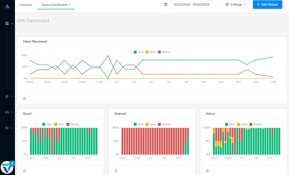 볼륨을 늘리는 것은 본질적으로 스트레스 테스트입니다. 이것이 IP 워밍 중에 배달 가능성 및 발신자 평판을 모니터링하는 것이 중요한 이유입니다. Validity의 Everest와 같은 전달 가능성 솔루션 구현을 고려하십시오. Everest를 사용하면 사서함 공급자가 메시지를 스팸 폴더에 넣거나 완전히 차단하도록 선택하는 시기를 확인할 수 있습니다(그림 1 참조). 따라서 볼륨을 계속 늘리는 대신 그에 따라 램프 업 전략을 조정할 수 있습니다.