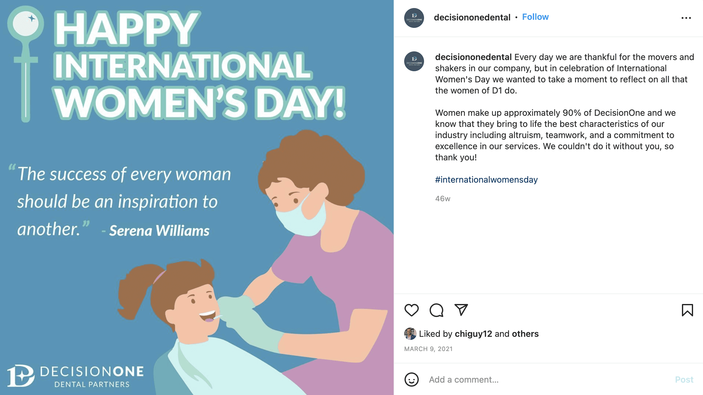 다음 은 건강 관리를 위한 소셜 미디어 마케팅 을 창의적으로 수행하는 방법에 대한 DecisionOne Dental의 또 다른 예입니다 . 고객의 성공 사례를 조명하거나 회사의 브랜드 가치를 전달하는 방식으로 회사가 소셜 미디어를 사용하여 대중 의 브랜드 인지도 를 형성하는 방법에 주목하십시오.