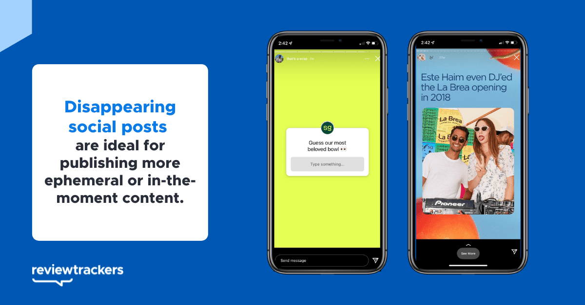 Snapchat, Instagram Stories 및 Facebook Stories와 같이 사라지는 비디오 콘텐츠 형식도 점점 인기를 얻고 있습니다. 이 포스트의 대부분은 24시간 이하의 유통기한을 가지고 있습니다. 이러한 유형의 소셜 미디어 마케팅 게시물은 일일 스페셜, 제품 티저, 이벤트 하이라이트, 설문 조사 및 빠른 발표와 같이 일시적이거나 즉각적인 콘텐츠를 게시하는 데 이상적입니다.