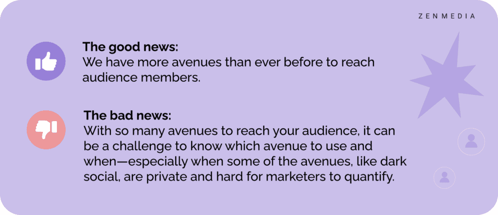 나쁜 소식: 청중에게 도달할 수 있는 방법이 너무 많기 때문에 어떤 방법을 언제 사용해야 하는지 아는 것이 어려울 수 있습니다. 특히 다크 소셜과 같은 일부 방법이 비공개이고 마케터가 수량화하기 어려운 경우에는 더욱 그렇습니다.
