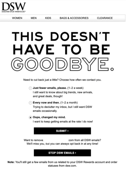 Gromadzenie większej liczby subskrybentów daje firmie więcej, niż pozwalanie im odejść. W przypadku wielu marek link do rezygnacji znajduje się w wiadomości e-mail, ponieważ prawo wymaga działającej rezygnacji z subskrypcji w każdym e-mailu.