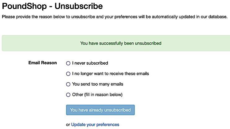 Kolejny punkt sporny: mylące kierunki. Strona anulowania subskrypcji PoundShop zapytała mnie o powód rezygnacji z subskrypcji, ale kiedy kliknąłem niebieski przycisk „Anuluj subskrypcję wszystkich e-maili marketingowych”, zobaczyłem tę stronę potwierdzenia: